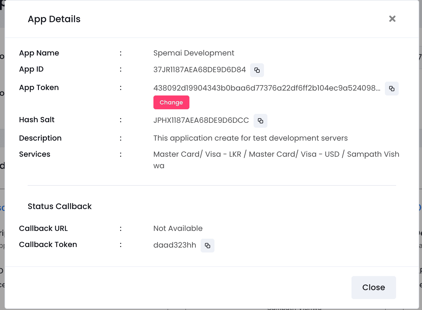 Now you can see the developer details needed to connect with your platform. Copy the APP ID, App Token, and Hash salt to properly connect Onepay with your platform. This requires technical expertise to implement, so please share our API documentation and configuration files with your technical team.
