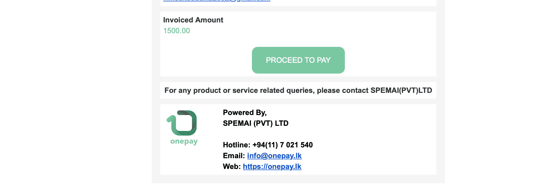 Click the Proceed to Pay button to pay the one-time setup fee of LKR 1500. Your portal will be activated for integration once the payment is completed. . Once you make the payment, you will receive a confirmation email. To download a PDF receipt, please access https://app.oneid.ink/login