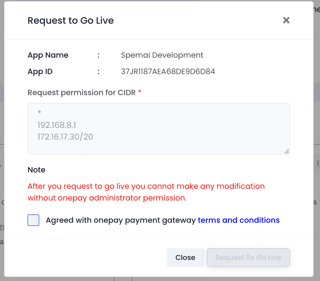 Click the star (*) symbol in the box below to verify the CAPTCHA, check the terms and conditions checkbox, and click the "Request to Go Live" button. Review our Terms and Conditions: https://www.onepay.lk/agreement.html (v2.2)